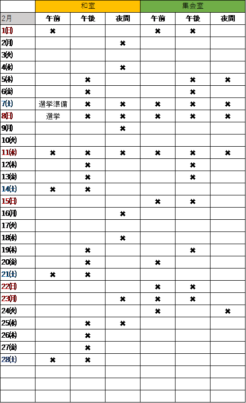 2月の部屋利用状況です。